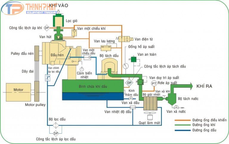 Sơ đồ nguyên lý hoạt động Máy nén khí trục vít ngâm dầu: